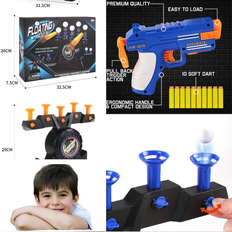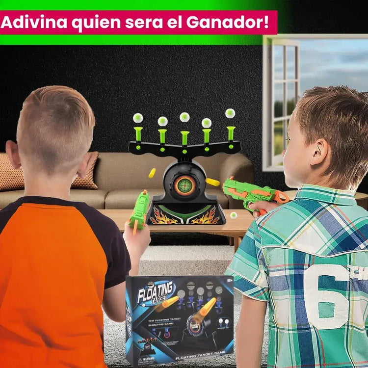 El juego incluye 2 pistolas de espuma, 10 bolas flotantes, un cable USB para la alimentación y un manual de instrucciones.